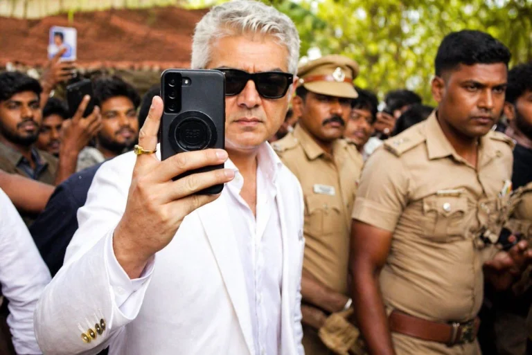 அப்படி அவர் வந்த போது வெள்ளை நிற கோட் சூட், மற்றும் கருப்பு நிற கண்ணாடி அணிந்து மிகவும் ஸ்டைலாக இருந்தார். அதோடு வழக்கத்திற்கு மாறாக தனது கையில் ஒரு கருப்பு நிற செல்போனையும் அஜித் வைத்திருந்தார்.
